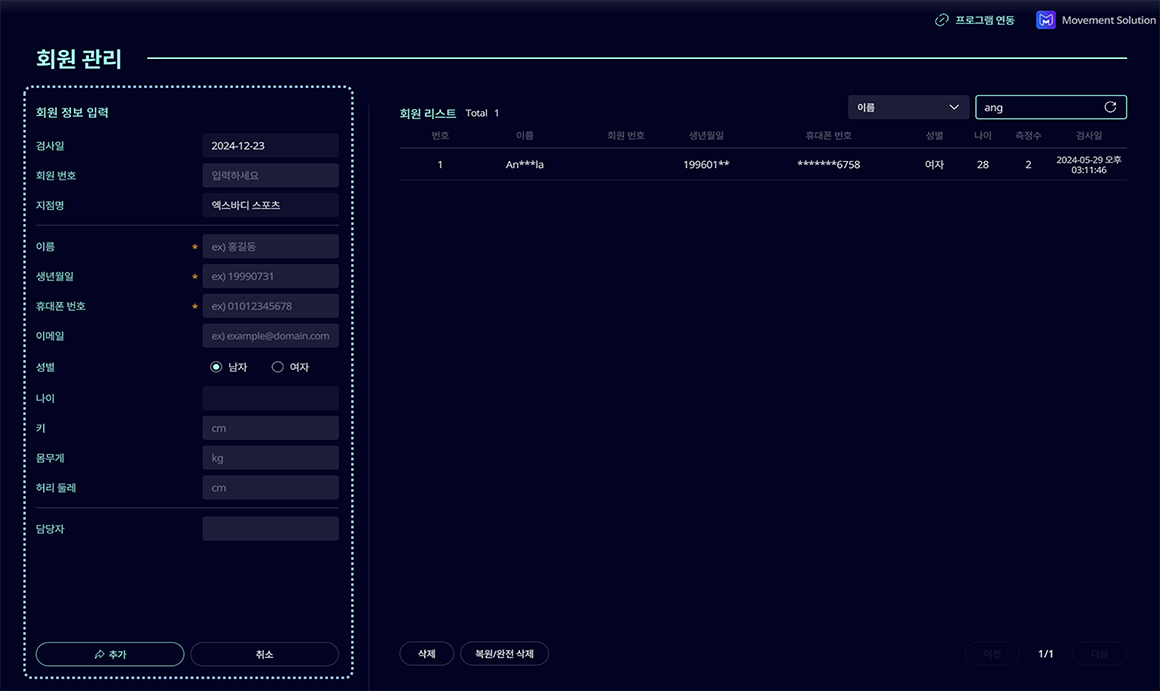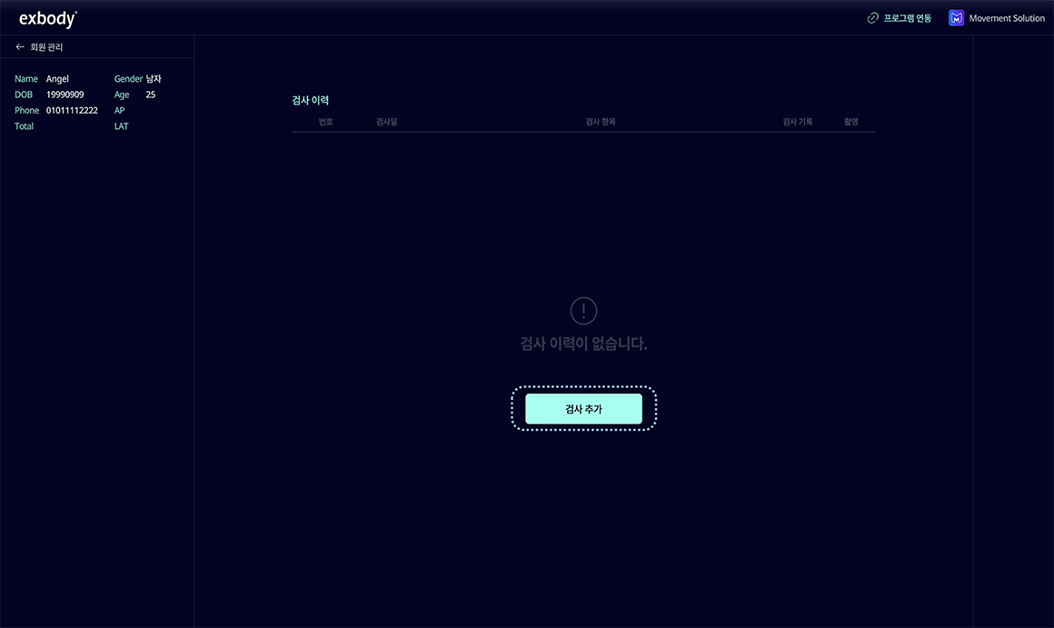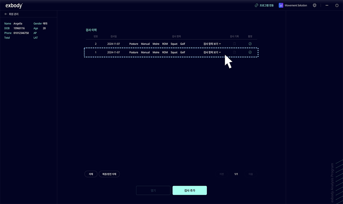 등록된 회원 정보를 더블 클릭하여 검사 이력을 확인합니다. 화면 중앙의 [검사 추가] 버튼을 클릭한 후 검사를 진행합니다.