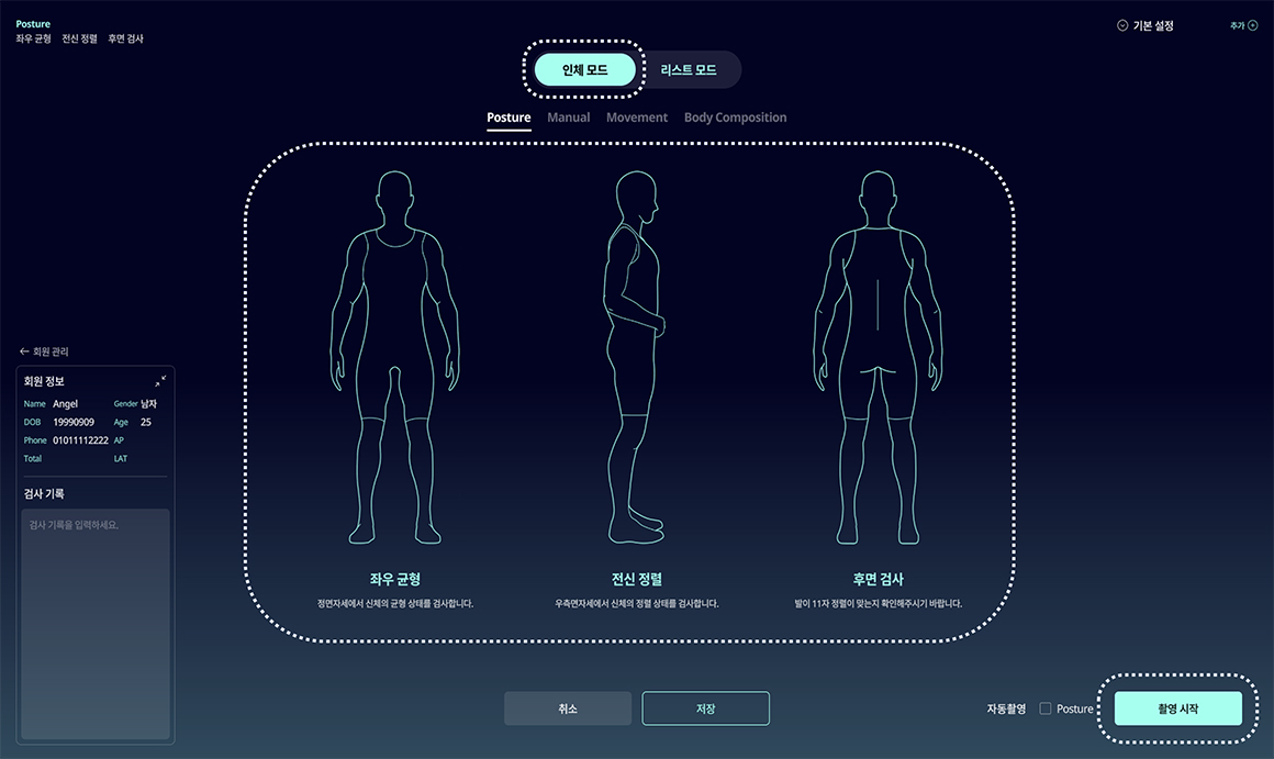 인체 모드에서 검사 항목을 선택한 후 오른쪽 하단의 촬영 시작을 클릭합니다.